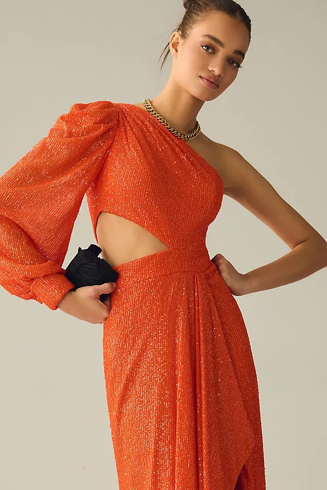With a one-shoulder blouson sleeve, sequined mesh overlay, side cutout, and a cascading thigh-high front slit, this gown is a glamorous go-to for a mirror ball moment.