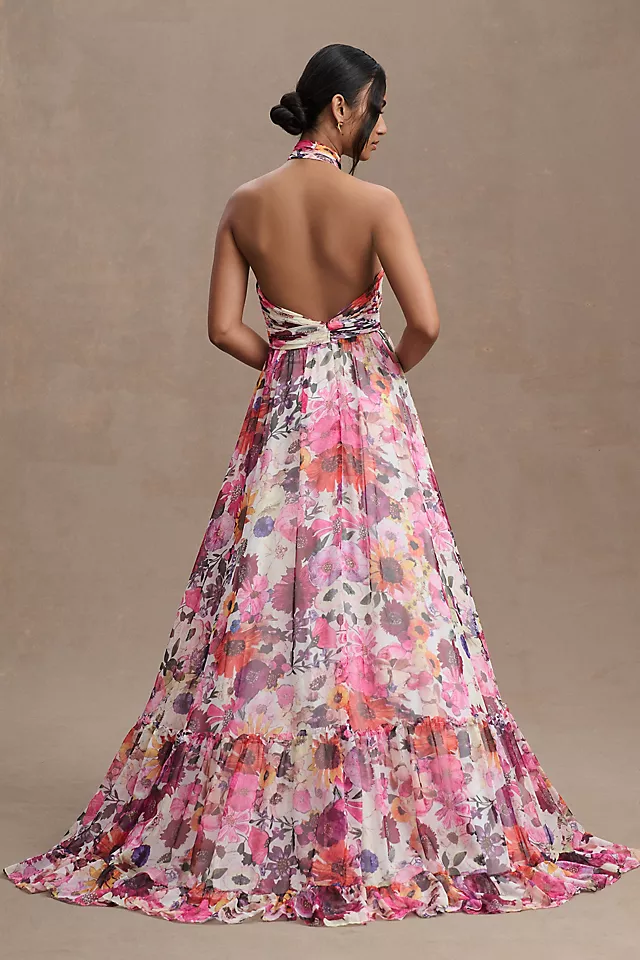 With an enchanting maxi silhouette that cascades from the halter neckline to the tiered ruffle skirt, the Mac Duggal Asymmetrical Halter Gown boasts an open back, pleated bodice, and cummerbund accent for a best-dressed guest look.