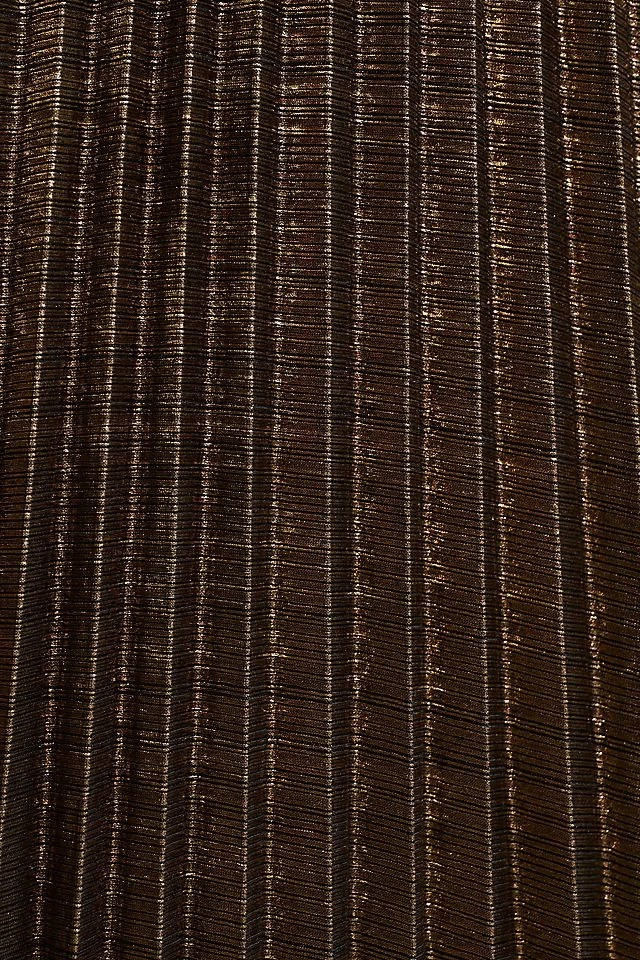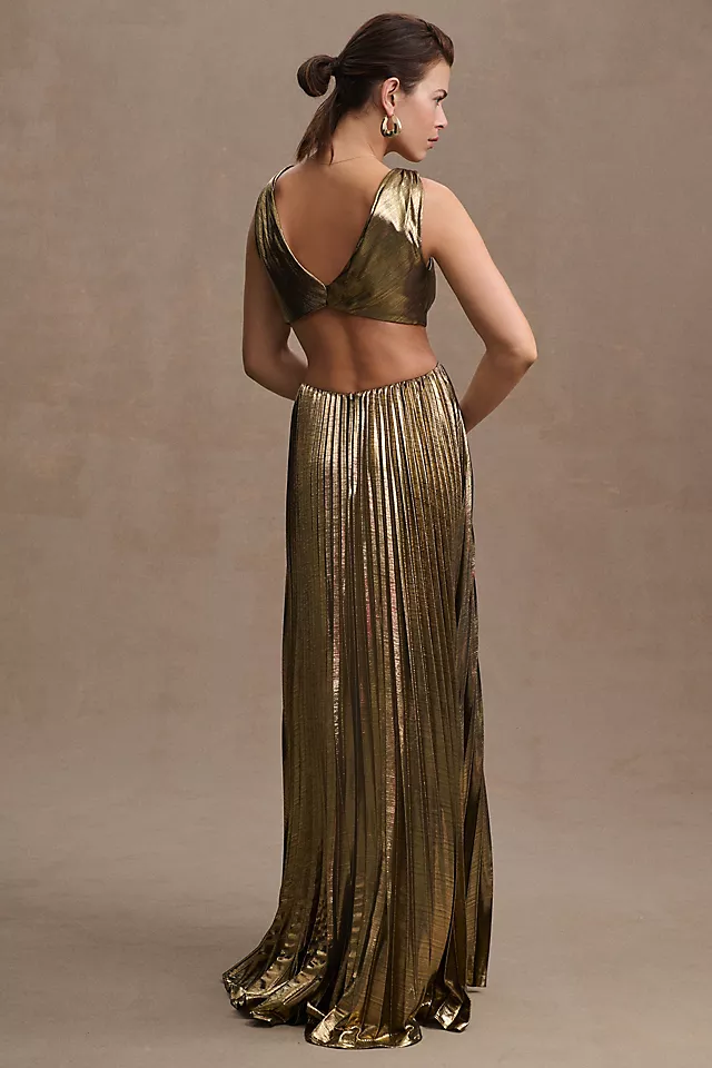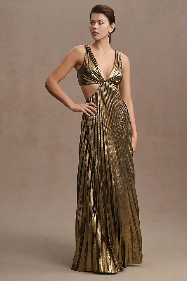 Fit for a glimmering goddess, the Mac Duggal Metallic Cutout Gown is a pleated maxi column silhouette that boasts a v-neckline, waistline cutouts, and a daring open back.