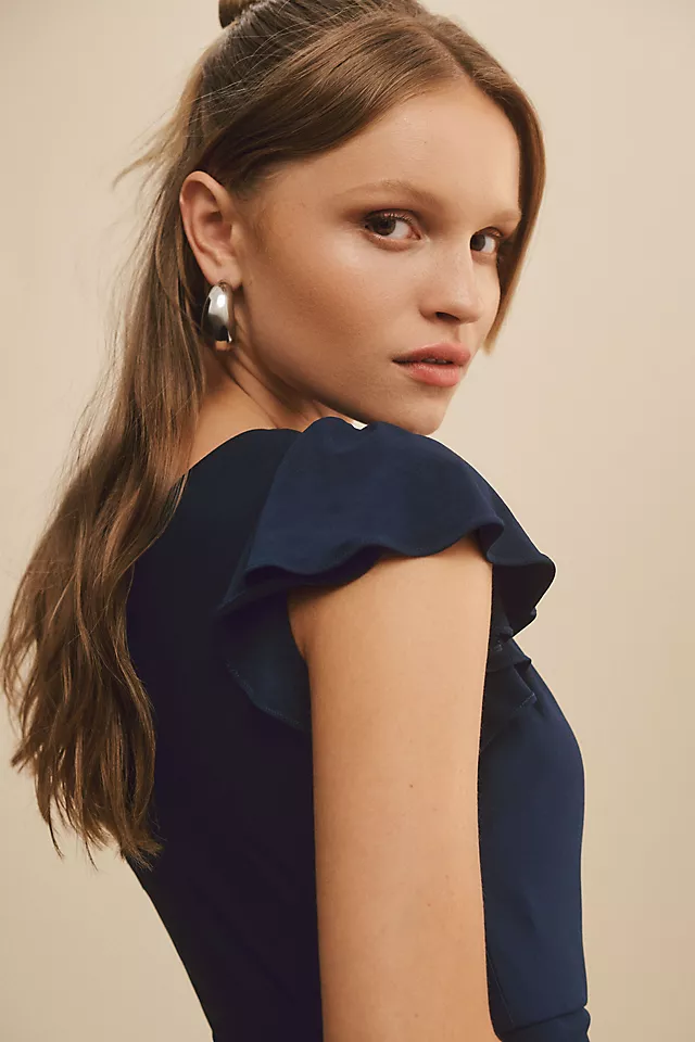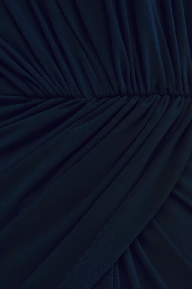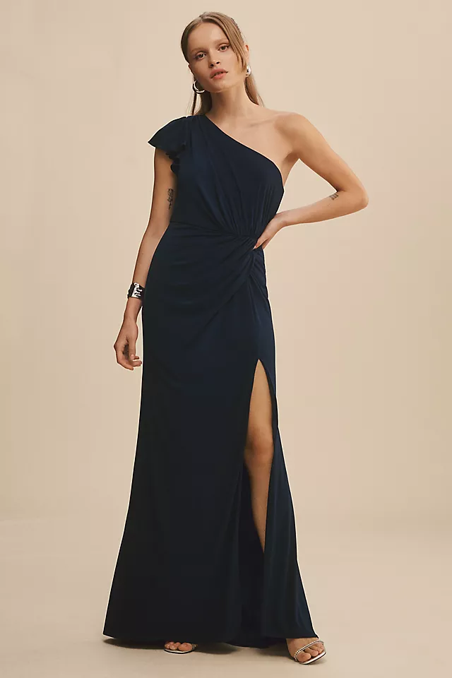 Rendered in jersey so you can dance all night long, the Mac Duggal One-Shoulder Column Gown flaunts an asymmetric neckline, single ruffled cap sleeve, draped bodice, and daring side slit.